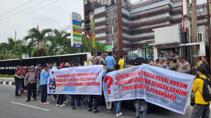 Massa aksi membawa spanduk besar bertuliskan “Bongkar Skandal Korupsi Disperindag Kota Pekanbaru di Bawah Kepemimpinan Zulhelmi Arifin”.
