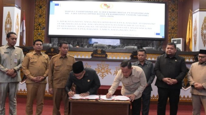 PEKANBARU – DPRD Kota Pekanbaru akhirnya mengesahkan Anggaran Pendapatan dan Belanja Daerah Perubahan (APBD-P) Tahun Anggaran 2025 pada rapat paripurna yang digelar Selasa (30/9/2025). Wali Kota Pekanbaru, H. Agung Nugroho SE MM hadir bersama Wakil Wali Kota Markarius Anwar ST MARch, Pj Sekda Zulfahmi Arifin, jajaran kepala organisasi perangkat daerah, serta unsur Forum Komunikasi Pimpinan Daerah (Forkopimda).