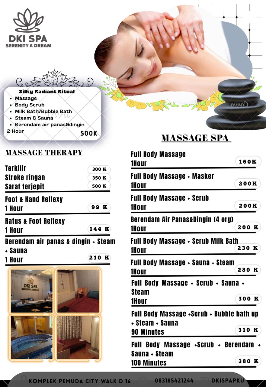 Selain terapi saraf terjepit, DKI SPA juga menyediakan berbagai layanan massage therapy dan spa treatment lainnya, seperti Full Body Massage, Body Scrub, Milk Bath, hingga Bubble Bath.