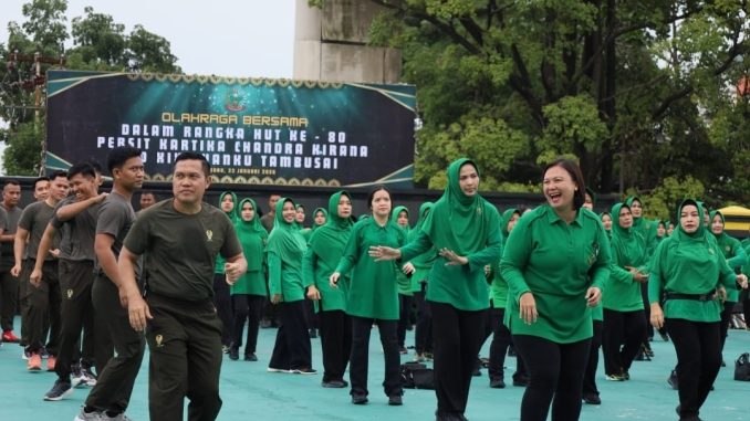 PEKANBARU | Siletperistiwa.com – Dalam rangka memperingati Hari Ulang Tahun (HUT) ke-80 Persit Kartika Chandra Kirana Tahun 2026, Kodam XIX/Tuanku Tambusai melaksanakan kegiatan olahraga bersama di lapangan depan Makodam XIX/Tuanku Tambusai, yang dilanjutkan dengan donor darah, bertempat di Gedung Kharuddin Nasution Makodam XIX/Tuanku Tambusai, Jalan Mayor Ali Rasyid No. 1 Pekanbaru, Jumat (23/1/2026).